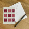 With a color palette of red and white, this notecard evokes the brick buildings around Harvard Square.