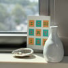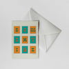 With a bold color palette of bright blues and oranges, this notecard evokes a retro feel.